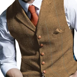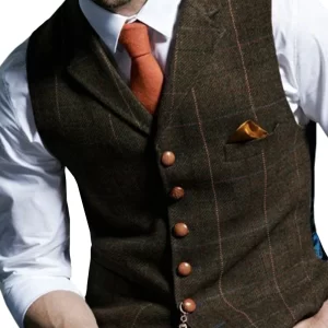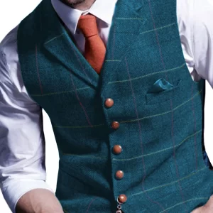 Gentleman Men’s Army Green Vest Plaid Soft Wool Jacket Tweed Business Waistcoat Steampunk Blazer For Wedding Groom
