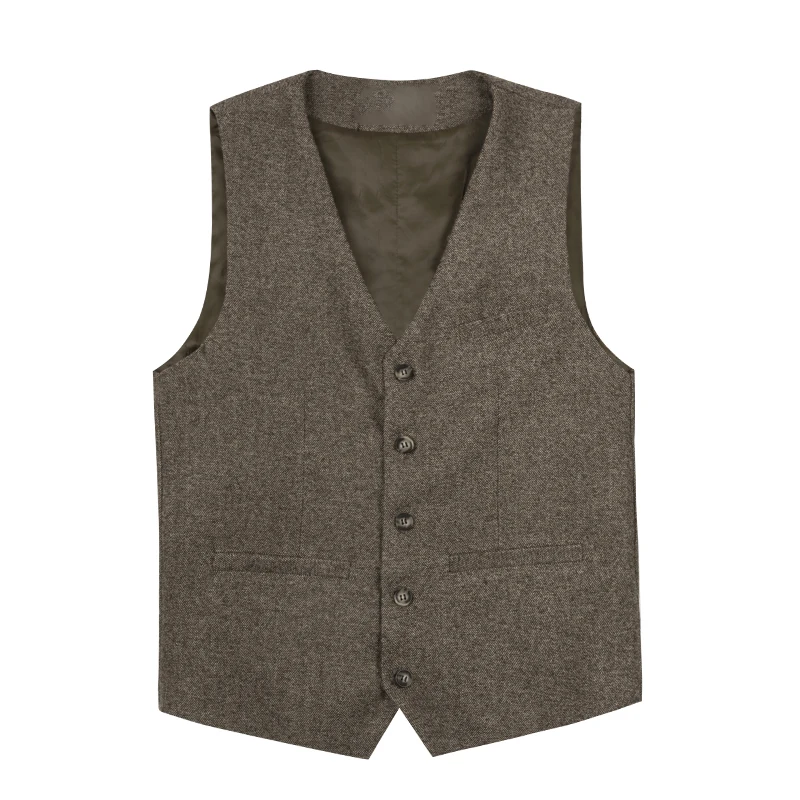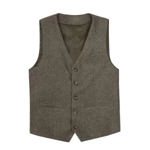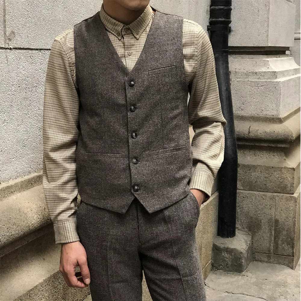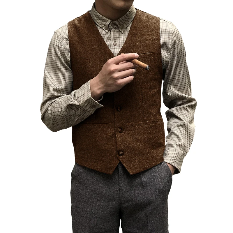Plus Size Men’s Suit Vest Dark Gray V Neck Herringbone Wool Tweed Groom Jacket Vintage Steampunk Vest Waistcoat for Male Wedding